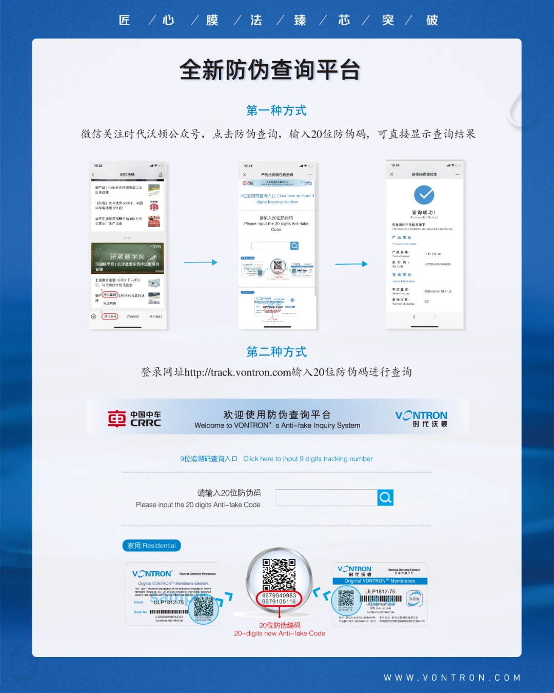 时代沃顿确保每一支售出的膜元件都带有防伪标识,凭码可追溯,消费者可通过时代沃顿官网、官方微信公众号、客服电话4000-111-880进行防伪查询,同时欢迎大家随时反馈市面售假、造假信息,共同维护健康有序的市场环境。
