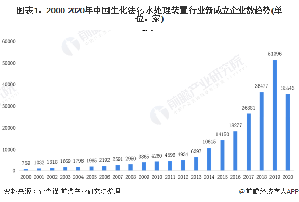 根据企查猫的数据显示,2000-2020国生化法污水处理装置行业新成立企业数呈现逐年上升趋势。自2014年起,中国生化法污水处理装置行业新成立企业数呈现爆发状态,在2019到了近年了峰值51396家,较2013年的6397家翻了将近5倍。截止到2020年12月初,中国生化法污水处理装置行业新成立企业数为35543家,已经逼近2018年全年的数据。
