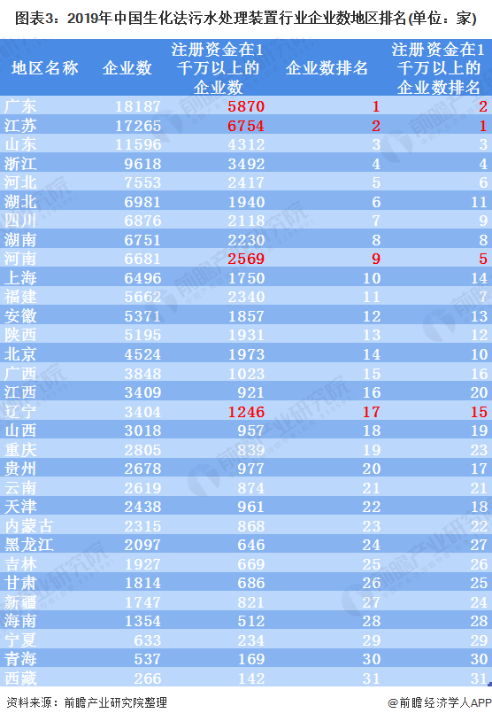 值得注意的是,排名第一的广东省共有18187家新成立企业,但是它的注册资金在1千万以上的企业数(5870家)却不如排名第二的江苏省(6754家)。因此,可以看出虽然广东省有18187家企业但是江苏省(17265家)才是中国生化法污水处理装置行业主要集中地。此外,河南省和辽宁省也是同样的情况,虽然企业数排名较后,但是其注册资金在1千万以上的企业数排名却比新成立企业数排名较为靠前。
