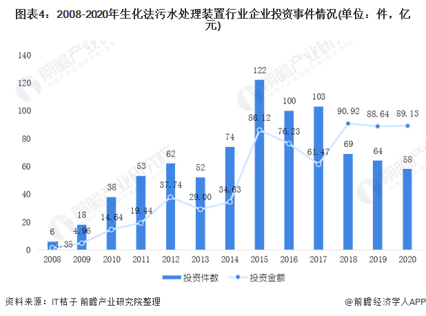 根据it桔子的数据显示,2008-2020年生化法污水处理装置行业企业投资事件呈现波动趋势。在2015年,生化法污水处理装置行业企业投资事件达到近年来峰值122件,但投资金额为86.12亿元。从投资金额角度来看,在2018年,生化法污水处理装置行业企业投资达到了近年来峰值90.92亿元。